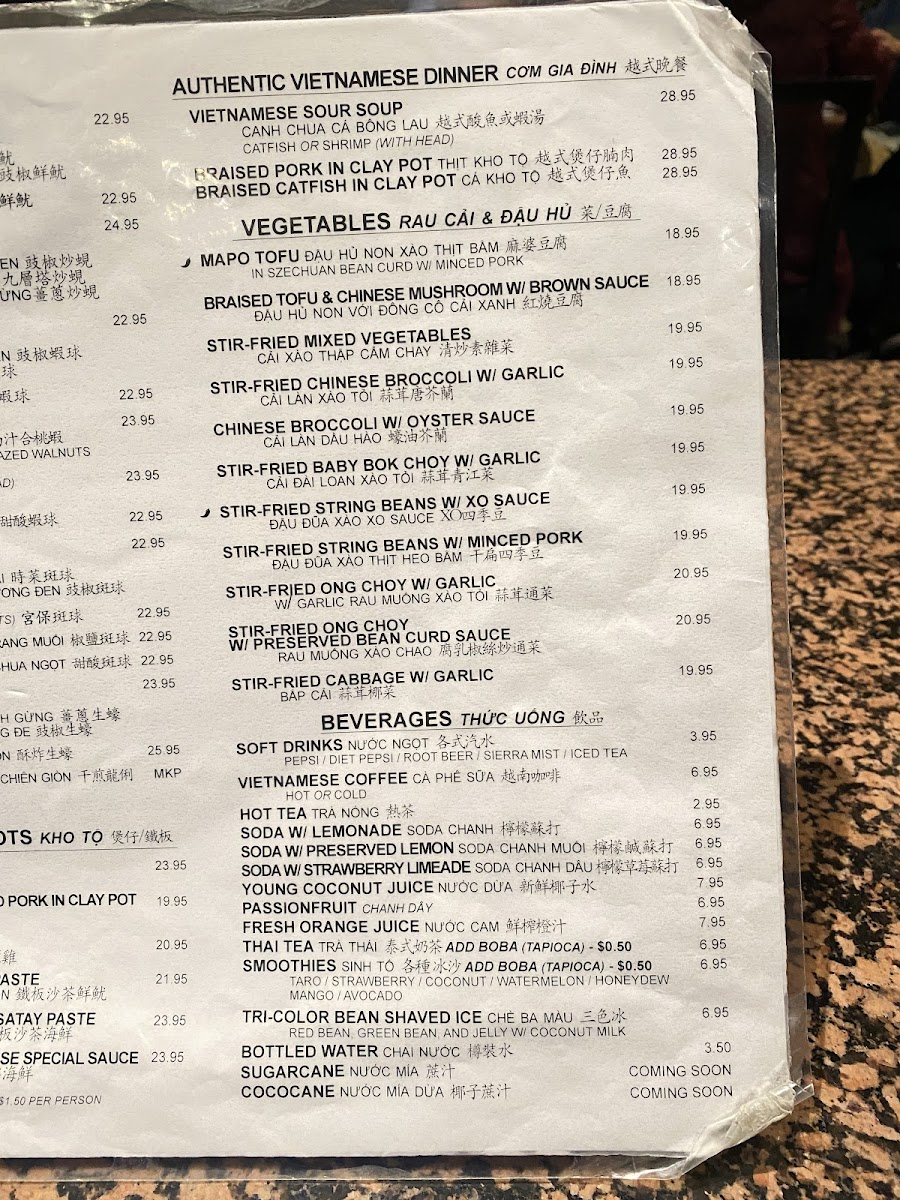 Those seeking refreshing beverages will find options from smooth and rich Vietnamese coffee to invigorating Sparkling Strawberry Lemonade at US$8.95. Each sip is meant to complement your meal, enhancing the overall dining experience.