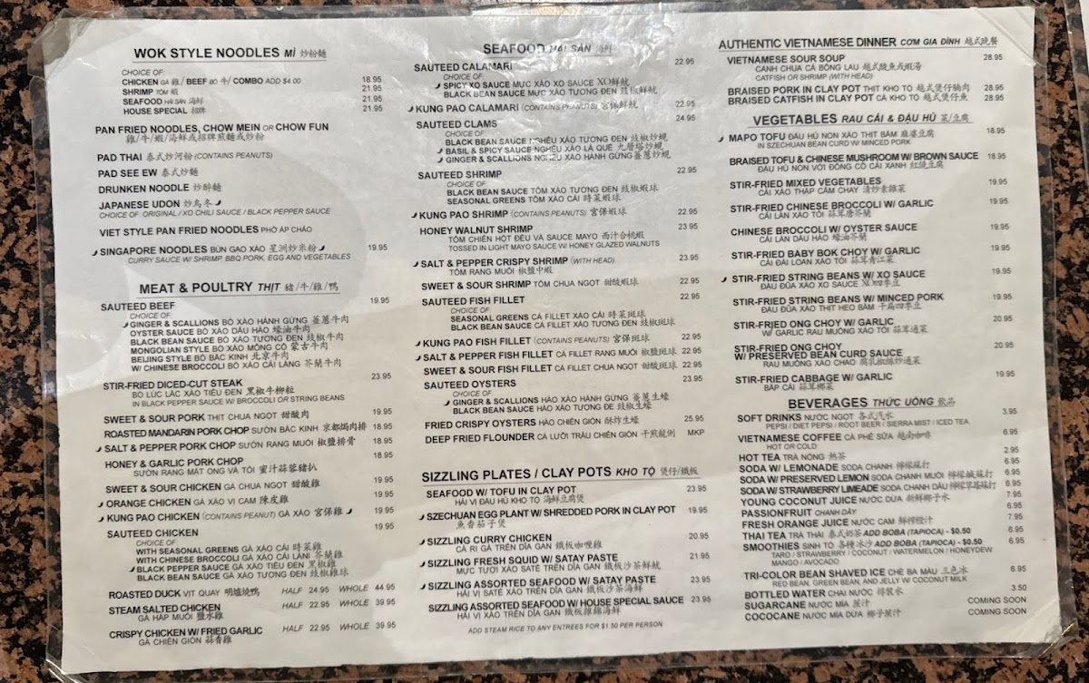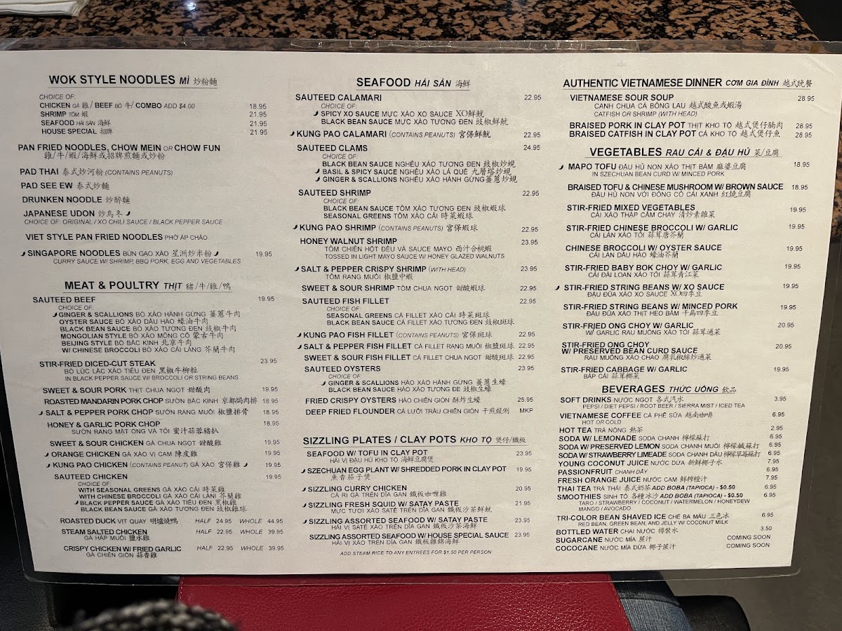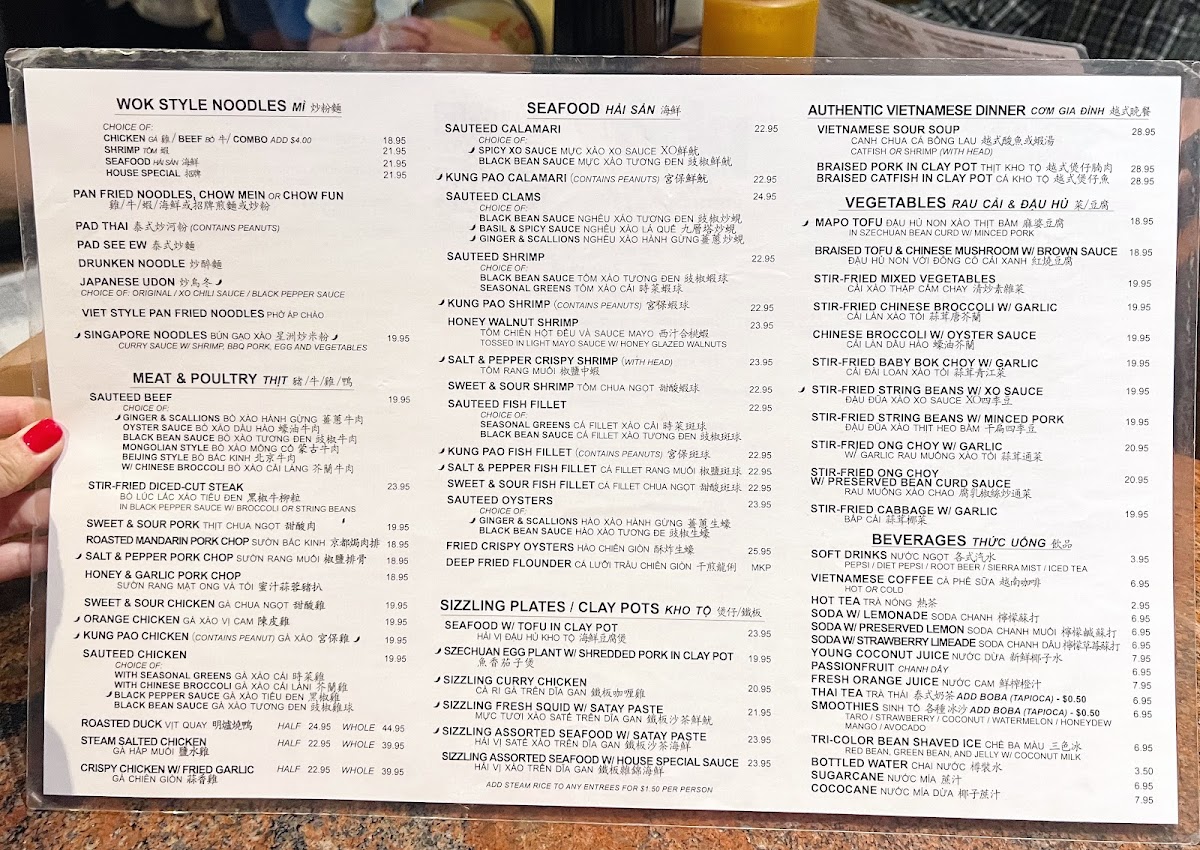 The menu offers a delightful array of classic Vietnamese flavors. Start your meal with the Fresh Spring Rolls, where plump shrimp or fried tofu is wrapped in delicate rice paper, served alongside a housemade peanut sauce that is simply irresistible at US$12.95. For something heartier, don't miss their signature Wor Wonton Soup — a comforting combination of wontons stuffed with minced pork and shrimp, swimming in a rich broth adorned with fresh vegetables, priced at US$23.50. And of course, no visit would be complete without a steaming bowl of pho, praised by many as one of the highlights of the menu.